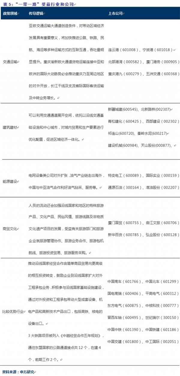 综合分析,我们认为,新疆、江苏、浙江、福建、广东、广西以及重要枢纽城市连云港、宁波港、泉州、厦门、广州值得重点关注,建筑建材、交通运输、电力油气、商贸旅游等行业将明显受益。