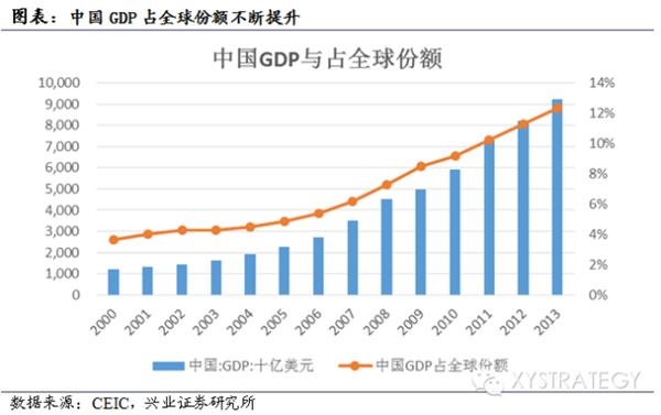 兴业证券指出,后危机时代,中国在世界经济中扮演的角色越发重要,2013年末,相比2008年末,中国GDP占全球GDP的比例,已经从7%提升到了13%,成为一支不可忽视的力量。在这样的背景下,中国对外政策发生系统性转变:以福塔莱萨金砖货币体系和金砖开发银行为标志性事件,“中国版的马歇尔计划”已经启动。而在2014年10月24日,以中国为首成立的亚洲基础设施投资银行,成为中国向全亚洲进行资本输出的战略性平台。